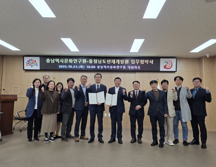 [뉴스스텝] 충남인재개발원과 충남역사문화연구원은 21일 연구원 대회의실에서 지역 인재 양성 및 역사·문화 가치 확산을 위한 업무협약을 체결했다.