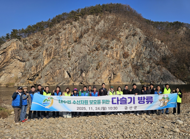 [뉴스스텝] 금산군은 지난 24일 부리면 적벽강 일원에서 지역 하천 생태계 복원과 수질 개선을 위해 약 300만 패의 다슬기를 방류했다.