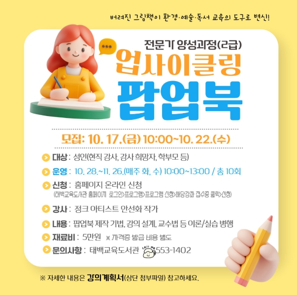 [뉴스스텝] 강원도교육청 태백교육도서관은 10월 28일부터 11월 26일까지 지역 내 지속 가능한 친환경 교육문화 확산 과 환경교육 전문 인력 양성을 위해 ‘2025년 업사이클링 팝업북 강사 자격과정’을 운영한다.