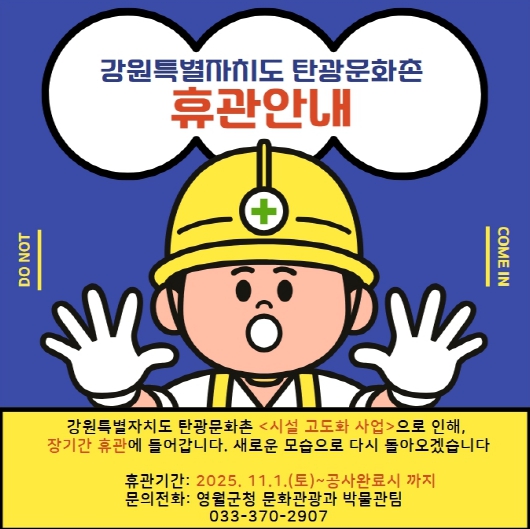 한편, 공사 진행 상황에 따라 휴관 기간은 변동될 수 있으며, 재개관 시점에 맞춰 새롭게 단장된 탄광문화촌의 전시와 체험 프로그램을 선보일 계획이다. 자세한 문의사항은 영월군 문화관광과 박물관팀으로 하면된다.