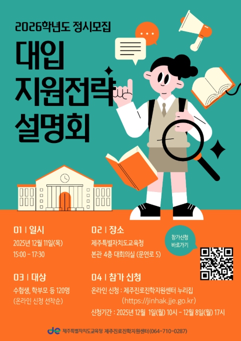 [뉴스스텝] 제주특별자치도교육청은 12월 11일 오후 3시부터 본관 4층 대회의실에서 ‘2026학년도 대입 정시모집 지원전략 설명회’를 개최한다.