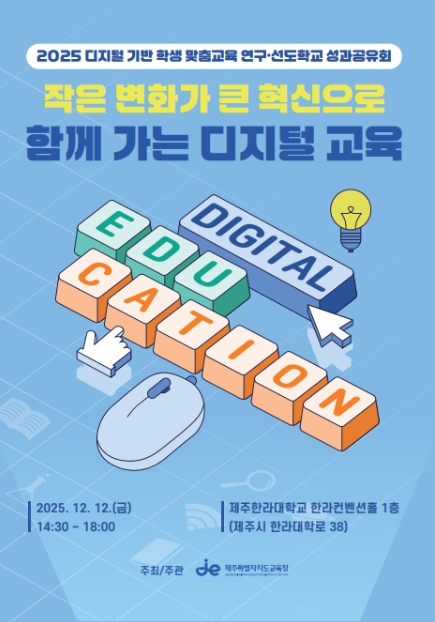 [뉴스스텝] 제주특별자치도교육청은 12일 제주한라대학 한라컨벤션홀에서 ‘2025 디지털 기반 학생 맞춤교육 연구·선도학교 운영결과 공유회’를 개최한다.