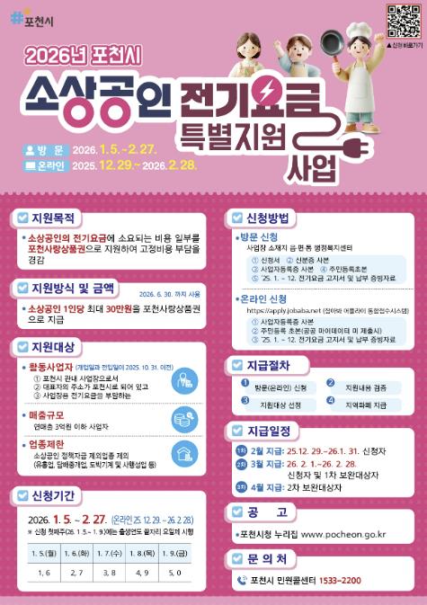 온라인 신청은 ‘잡아바 어플라이’ 통합접수시스템을 통해 2026년 2월 28일까지 가능하며, 방문 신청은 사업장 소재지 읍면동 행정복지센터에서 2월 27일까지 신청을 받는다. 지원 금액은 최대 30만 원으로 포천사랑상품권으로 지급되며, 신청 시 사업자등록증 사본, 주민등록초본, 2025년 1월부터 12월까지의 전기요금 고지·납부 증빙자료를 제출해야 한다.