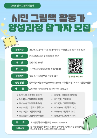 박남미 전주시 도서관평생학습본부장은 “그림책 활동가 양성 과정을 통해 지역 그림책 기반이 강화되고 시민들이 그림책 문화를 폭넓게 향유할 수 있기를 기대한다”면서 “그림책에 관심이 있는 시민들은 적극적인 참여를 부탁드린다”고 말했다.