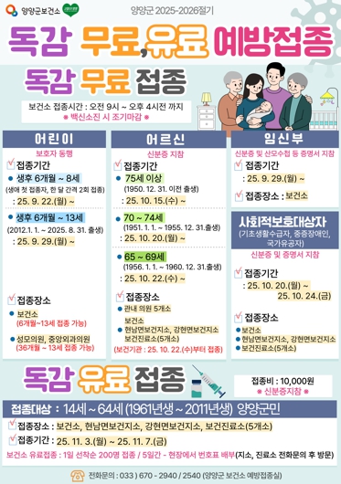[뉴스스텝] 양양군이 2025년 9월 22일부터 어린이를 시작으로 임신부, 어르신 대상 인플루엔자 무료 예방접종을 실시한다.