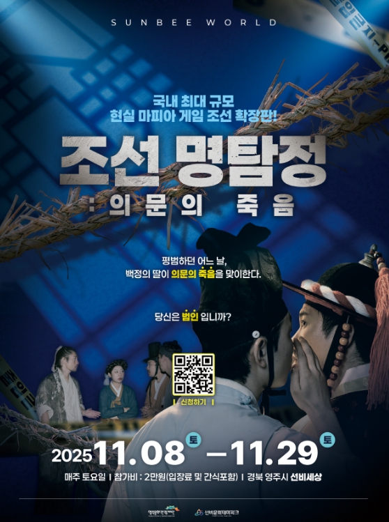 [뉴스스텝] 영주시 선비세상에서 오는 11월 8일부터 매주 토요일, 참가자가 직접 조선시대 인물이 되어 연쇄 살인 사건의 진실을 밝혀야 하는 국내 최대 규모 체험형 마피아 게임 ‘조선명탐정: 의문의 죽음’이 개최된다.