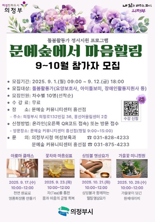 [뉴스스텝] 의정부시는 9월 1일부터 돌봄활동가를 위한 정서 지원 프로그램 ‘문예숲에서 마음힐링’의9~10월 참가자를 모집한다.