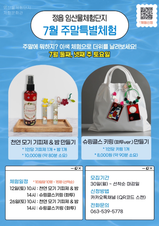 체험비는 천연 모기 기피제와 밤 만들기 9000원, 키링 만들기 체험은 8000원이다. 여름철 실용성과 재미를 모두 갖춘 프로그램으로 구성돼 가족 단위 방문객은 물론 체험형 관광을 찾는 이들에게 큰 호응이 기대된다.