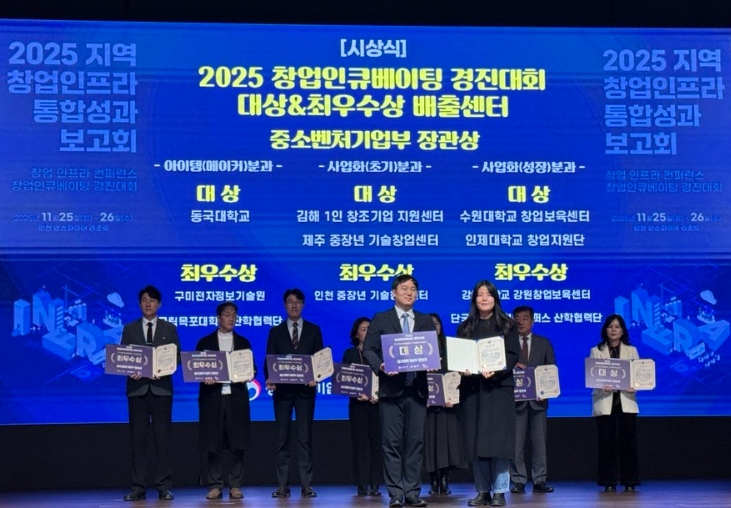 이번 수상은 센터에서 추진해 온 입주기업 지원 프로그램과 운영 성과를 공식적으로 인정받은 결과로, 특히 올해는 입주기업인 (주)크로스허브에서 중소벤처기업부 주최 ‘2025 창업 인큐베이팅 경진대회’ 사업화(초기)분과 서비스 부문에서 최종 대상을 수상하는 성과를 거두었다.