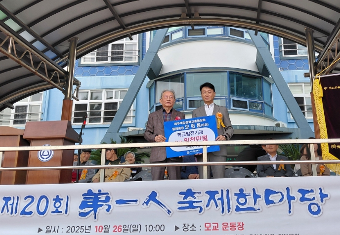 [뉴스스텝] 제주도교육청 제주제일중학교는 26일 열린 제20회 제주제일중학교 총동문회‘제일인(弟一人) 축제 한마당’에서 제8회 졸업생 오헌봉 ㈜유성건설 회장이 학교 발전을 위해 2025년부터 2027년까지 3년간 매년 1천만 원씩, 총 3천만 원의 발전기금을 기탁하기로 하고 첫 해분 1천만 원을 전달했다고 밝혔다.