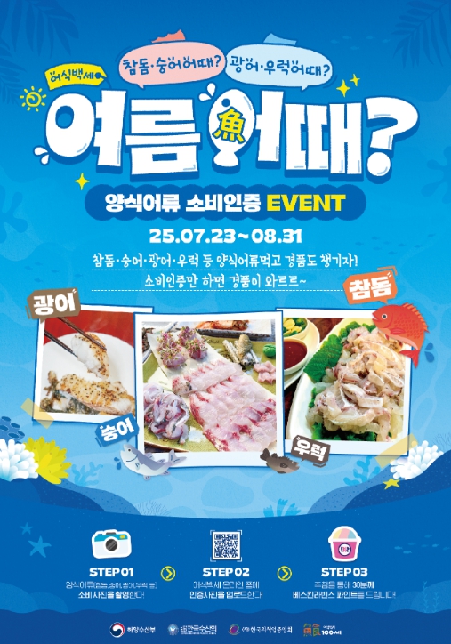 [뉴스스텝] 해양수산부는 여름철 양식수산물 소비 활성화를 위해 7월 23일부터 8월 31일까지 한국수산회·한국외식업중앙회·수협중앙회와 함께 '어식백세-여름어(魚)때?' 캠페인을 실시한다고 밝혔다.
