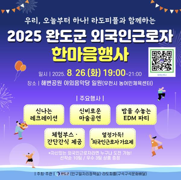 [뉴스스텝] 완도군은 8월 26일 오후 7시, 완도 해변공원 야외 음악당에서 외국인 근로자와 주민이 함께 어우러지는 『2025 외국인 근로자 한마음 행사』를 개최한다.