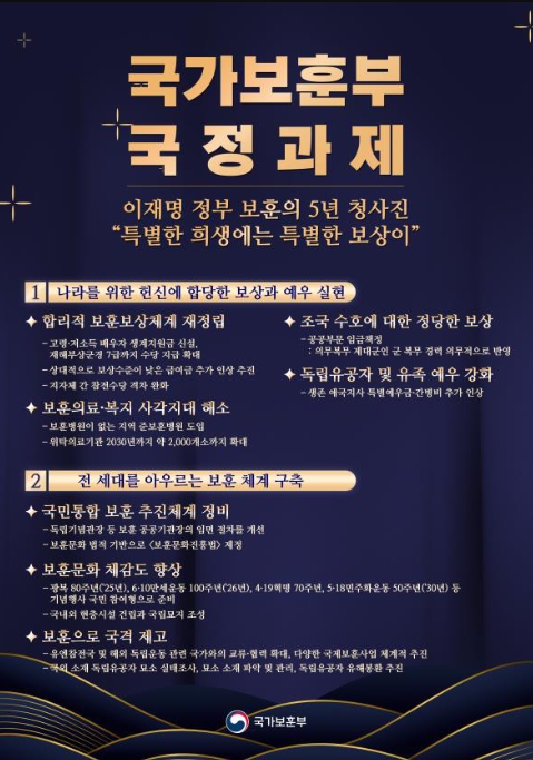 특히, 새정부 보훈정책은 ‘특별한 희생에는 특별한 보상이 있어야 한다’는 대통령의 철학에 부합하도록 했으며, 이를 통해 국가유공자의 건강한 삶을 책임지고, 국민통합을 견인하며, 국민 눈높이와 국격에 걸맞는 보훈의 역할을 확대할 방침이다.