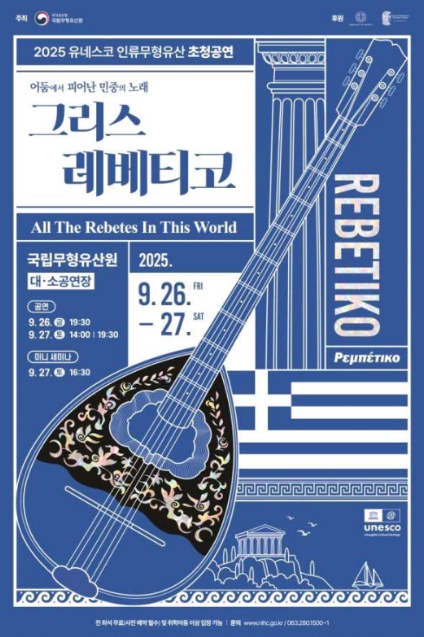 [뉴스스텝] 국가유산청 국립무형유산원은 오는 9월 26일과 27일 총 3회에 걸쳐 국립무형유산원(전북 전주시) 얼쑤마루 대공연장에서 유네스코 인류무형유산 초청공연 '그리스 레베티코'를 개최한다.