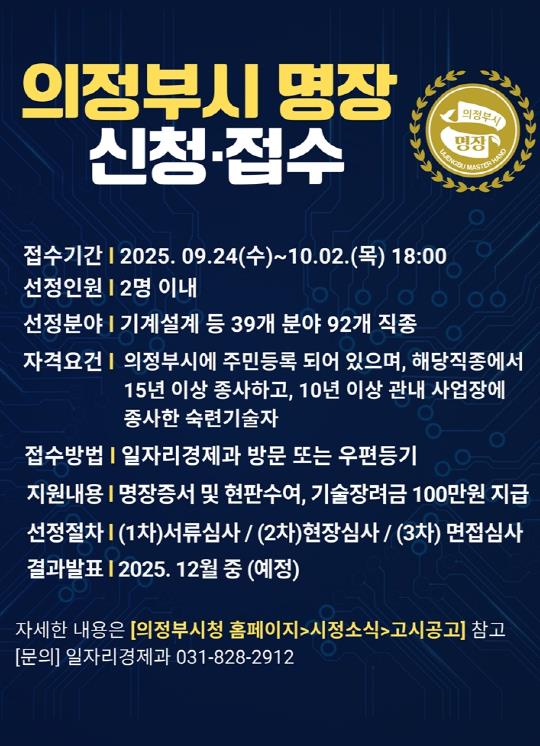 [뉴스스텝] 의정부시는 우수 숙련기술인을 발굴하고 숙련기술 우대 문화를 확산하기 위해 ‘2025년도 의정부시 명장’을 공모해 선정한다.