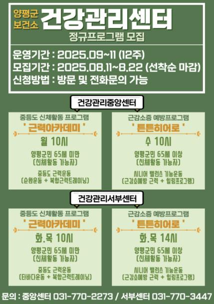 [뉴스스텝] 양평군 보건소 건강관리센터에서 오는 8월 11일부터 22일까지 하반기 신체활동 정규 프로그램 참여 대상자를 모집한다고 밝혔다.