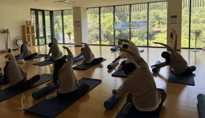 ▲ 화성시아동청소년정신건강복지센터 청소년 캠프 '쉬멍 놀멍' 참가자들이 스트레칭 강좌에 참여하고 있다 |
