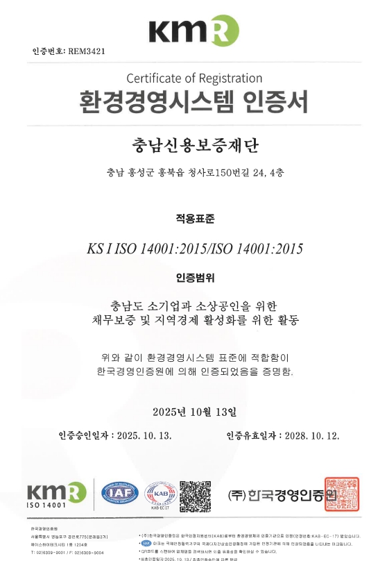 [뉴스스텝] 충남신용보증재단은 한국경영인증원(KMR)으로부터 ISO 14001:2015(환경경영시스템) 인증을 취득했다고 17일 밝혔다.