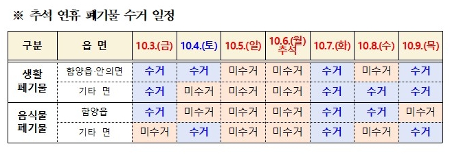 생활 쓰레기 수거 일정은 ▲3일 전 읍면 ▲4일 함양읍·안의면 ▲7일 전 읍면 ▲8일 함양읍·안의면 외 기타 면 ▲9일 전 읍면에서 정상 수거한다.