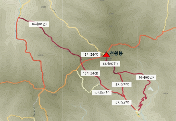 분석에 따르면 오후 1시~4시 사이 하산 구간에서 사고의 약 41%가 발생했으며, 주된 원인은 조난(32.2%), 사고·부상(29.6%), 질환(11.9%) 등으로 나타났다. 산행 시 체력 저하로 인한 부주의나 건강 상태를 고려하여 자기 몸에 맞는 등산 코스를 선택하는 것이 사고 예방에 도움이 된다.