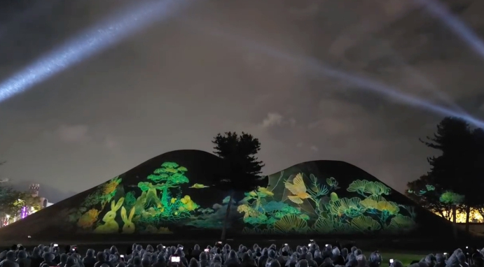 대릉원 고분군 곳곳에 설치된 미디어파사드와 LED 조명, 모션캡처, AI 인터랙티브 기술을 통해 고대 신라의 왕릉이 빛과 예술로 되살아나는 환상적인 장면이 연출된다.