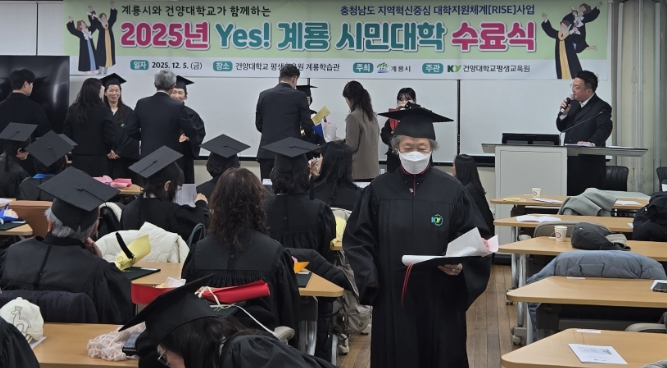 [뉴스스텝] 계룡시는 지난 5일 건양대와 충청남도 지역혁신중심 대학지원체계(RISE)사업의 일환으로 운영한, ‘2025년도 Yes! 계룡 시민대학 수료식’을 건양대 평생교육원에서 성황리에 개최했다고 밝혔다.