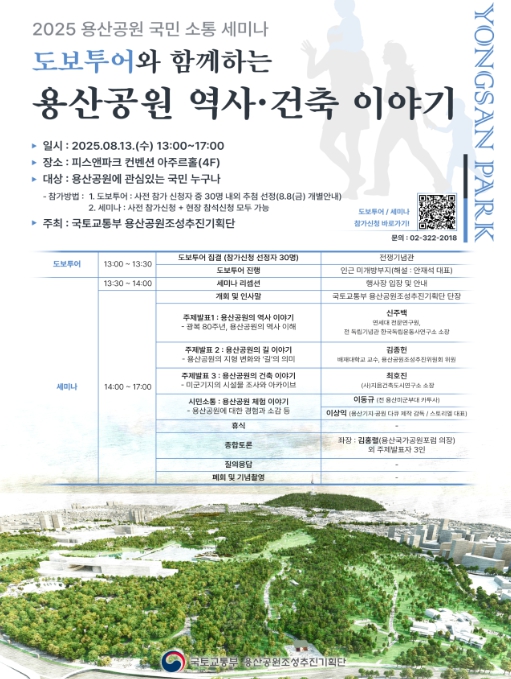 [뉴스스텝] 국토교통부는 8월 13일 오후 전쟁기념관(서울 용산) 부지 내에 있는 피스앤파크 컨벤션에서 '도보 투어와 함께하는 용산공원 역사·건축 이야기 세미나'를 개최한다.