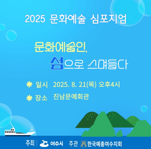 [뉴스스텝] 여수시는 오는 8월 21일 오후 4시 진남문예회관에서 ‘2025년 문화예술심포지엄(1차) – 문화예술인, 섬으로 스며들다’를 개최한다고 밝혔다.