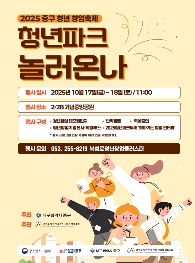 [뉴스스텝] 대구 중구는 청년창업가와 지역 주민이 함께 어울릴 수 있는 교류의 장을 마련하고자 2025년 중구 청년창업 축제 '청년파크 : 놀러온나'를 오는 10월 17일부터 18일까지 양일간 2·28기념중앙공원에서 개최한다고 밝혔다.