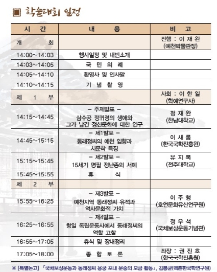 학술대회에서는 아홉 명의 연구자가 ▲삼수공 정귀령의 생애와 그가 남긴 정신문화에 대한 연구 ▲동래정씨의 예천 입향과 시문학 특징 ▲15세기 명필 정난종의 서예 ▲예천지역 동래정씨 유적과 역사문화적 가치 ▲항일 독립운동사에서 동래정씨의 역할 고찰을 주제로 발표와 토론을 이어간다.