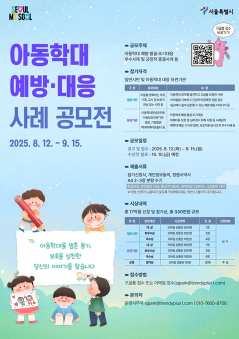 서울시는 아동학대 예방과 효과적인 대응 사례를 발굴하고 공유‧확산함으로써 아동학대에 대한 시민과 유관기관의 관심을 높이기 위한 ‘아동학대 예방·대응 사례 공모전’을 개최한다고 밝혔다.