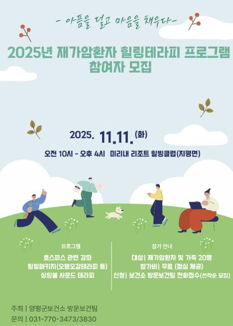 [뉴스스텝] 양평군은 재가암환자와 그 가족을 대상으로 ‘2025년 재가암환자 힐링테라피 프로그램’ 대상자를 모집한다고 밝혔다. 프로그램은 오는 11월 11일, 양평 미리내 리조트 내 힐빙클럽에서 진행될 예정이며, 총 20명을 모집한다.