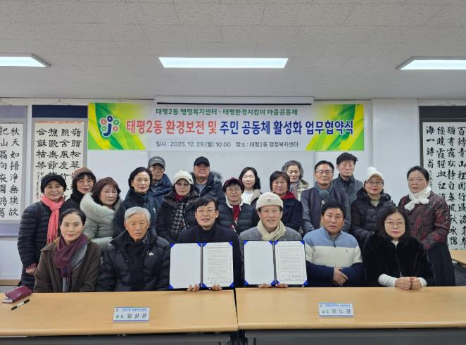 이번 협약을 통해 ▲태평2동 및 인근 지역 하천·마을 환경정화 및 생태계 보전 ▲꽃길과 녹지 조성, 산책로 관리, 안전문화 정착 등 환경개선 사업 협력 ▲주민·청소년 대상 환경교육 및 캠페인 전개 ▲관련 정책·정보의 공유 및 지원 확대 ▲공동체 발전을 위한 다양한 협력 등을 약속했다.