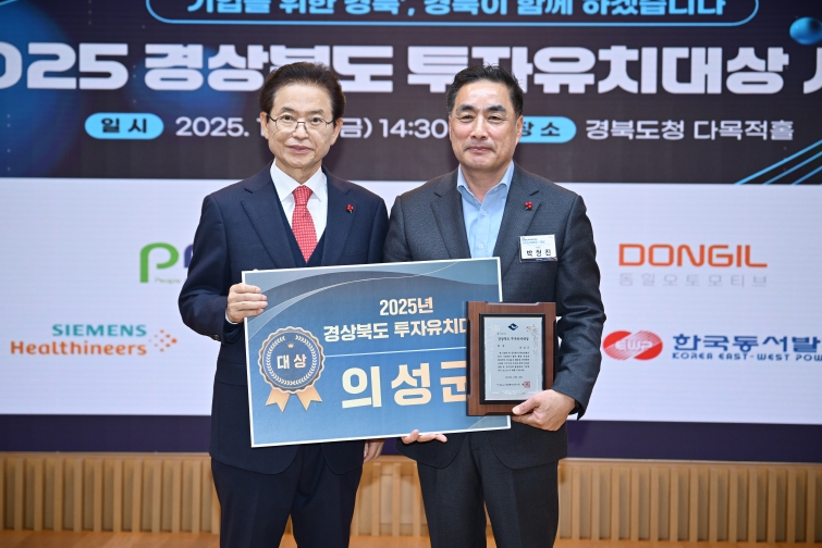 [뉴스스텝] 의성군은 지난 19일 경북도청에서 열린 ‘2025년 경상북도 투자유치대상’ 시상식에서 투자유치 활성화 성과를 인정받아 3년 연속 대상을 수상했다고 밝혔다.