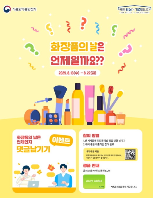 이번 이벤트는 식약처 누리소통망(인스타그램)을 통해 국민 누구나 참여할 수 있으며, 참가자 중 추첨을 통해 선물을 제공한다. 또한 8월 25일부터 식약처 누리소통망(인스타그램)를 통한 ‘화장품의 날 응원 이벤트’도 실시할 예정이다.