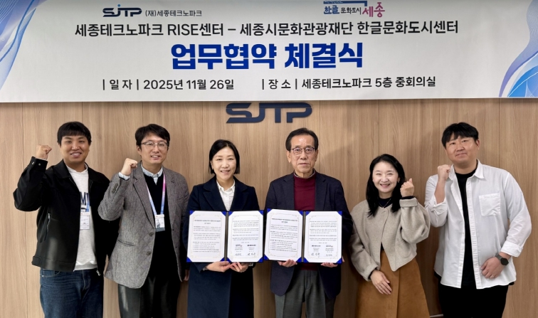 [뉴스스텝] 세종시문화관광재단 한글문화도시센터(센터장 양유정)와 세종테크노파크 RISE센터(센터장 윤석무)가 ‘한글문화도시 세종’ 조성과 지역혁신 역량 강화를 위한 협력에 나섰다.
