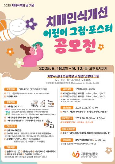 [뉴스스텝] 인천광역시 계양구는 치매극복의 날(9월 21일)을 맞아 치매 공존사회 조성을 위한 ‘2025 치매인식개선 어린이 그림·포스터 공모전’을 개최한다고 밝혔다.