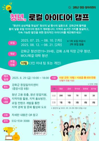 [뉴스스텝] 강화군 창업·일자리센터가'2025년 청년의 날 행사'의 일환으로 오는 8월 29일, ‘청년, 로컬 아이디어 캠프’를 개최한다고 밝혔다.