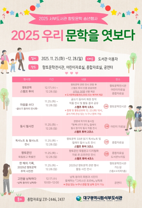 [뉴스스텝] 대구서부도서관은 11월 25일부터 12월 31일까지 2025년 한 해를 마무리하며 지역 문학에 대한 관심을 높이고 향토문학의 가치를 되새기기 위해 '2025 우리 문학을 엿보다' 송년행사를 운영한다.