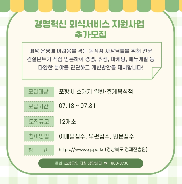 [뉴스스텝] 포항시는 지역 외식업소의 경쟁력 강화를 위한 ‘2025년 경영혁신 외식서비스 지원사업’을 추진하며 오는 7월 31일까지 2차 참여업소를 모집한다고 밝혔다.