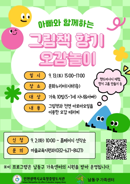 [뉴스스텝] 천광역시교육청중앙도서관은 9월 13일 ‘아빠와 함께하는 그림책 향기 오감놀이’ 프로그램을 운영한다고 밝혔다.