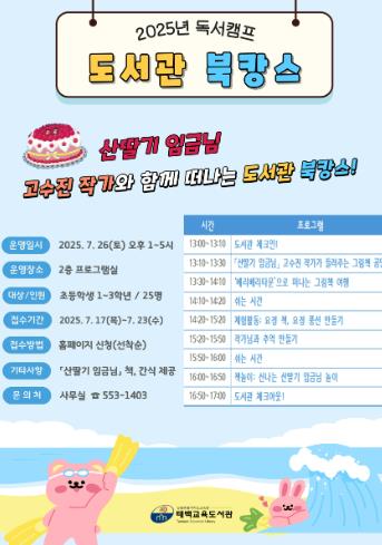 2025년 독서캠프는 여름 더위를 피해 시원한 도서관에서『산딸기 임금님』의 저자 고수진 작가와 함께 떠나는 도서관 북캉스를 주제로 진행된다.