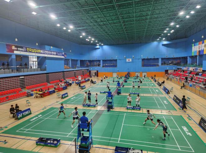 ▲ 밀양시배드민턴경기장에서 열린 ‘2025 연맹회장기 전국실업대학배드민턴선수권대회’경기 장면