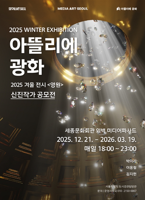 서울시는 21일부터 내년 3월 19일까지 매일 밤 ‘미디어아트 서울’ 전시플랫폼 3곳(아뜰리에 광화, 해치마당 미디어월, 서울로미디어캔버스)에서 겨울 전시를 무료로 선보인다. 해치마당 미디어월은 08시부터 22시까지, 나머지는 18시부터 23시까지 운영한다.