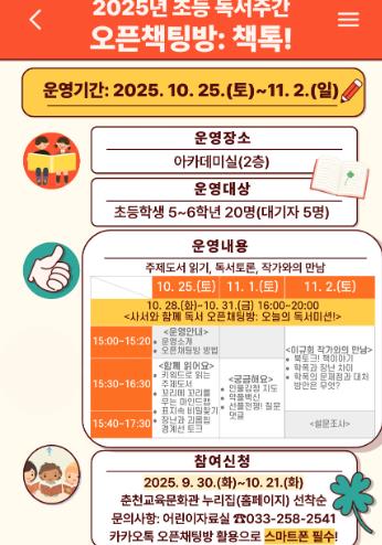 [뉴스스텝] 춘천교육문화관은 책 읽기 좋은 계절인 가을을 맞아 오는 10월 25일, 10월 28일부터 11월 2일까지 초등학생 5~6학년 학생 20명을 대상으로 초등 독서주간 ‘오픈책팅방 책톡!’을 운영한다.
