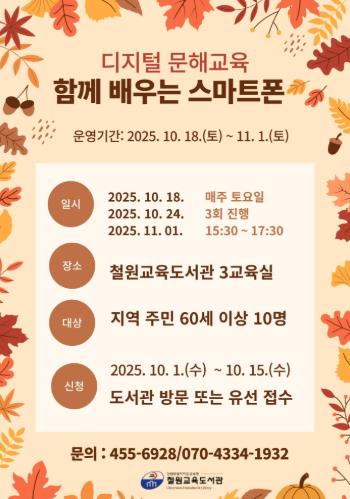 [뉴스스텝] 철원교육도서관은 지역 고령층의 디지털 활용 능력 향상과 격차 해소를 위해 오는 10월 18일부터 11월 1일까지 매주 토요일, 총 3회에 걸쳐 ‘함께 배우는 스마트폰’ 디지털 문해교육을 운영한다.