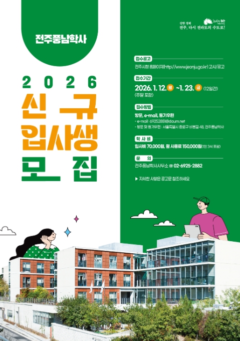 전주시는 12일부터 23일까지 수도권 소재 대학에 진학한 전주·완주 출신 대학생을 대상으로 2026년도 신규입사생 43명을 모집할 계획이라고 2일 밝혔다.