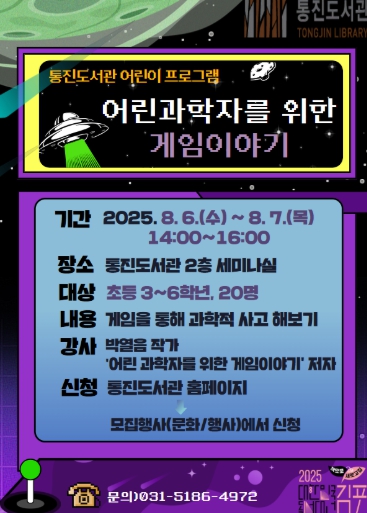 [뉴스스텝] 김포시 통진도서관은 오는 8월 6일부터 7일까지 이틀간 오후 2시부터 4시까지 초등학생을 대상으로 과학과 인문학을 쉽고 흥미롭게 접할 수 있는 특별한 프로그램 '어린 과학자를 위한 게임 이야기' 운영한다고 밝혔다.