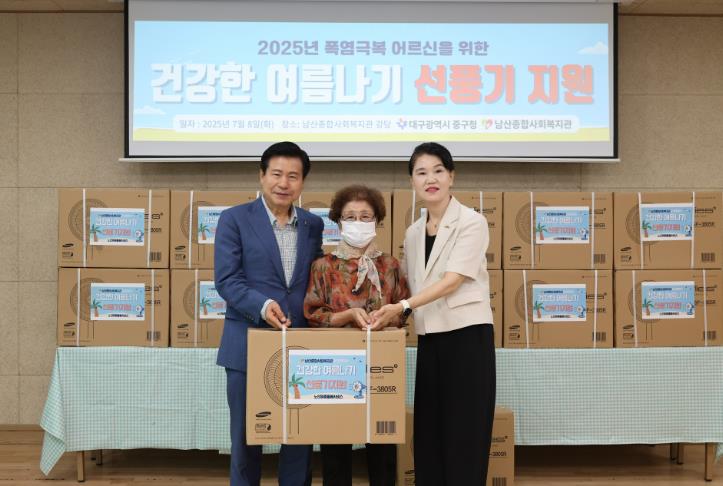 [뉴스스텝] 대구 중구는 8일 남산종합사회복지관에서 ‘건강한 여름나기 선풍기 전달식’을 열고, 관내 65세 이상 홀로 어르신 50명에게 선풍기 50대를 전달했다.