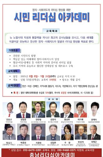 충청남도의 지속가능한 발전과 지역사회의 유능한 리더십 역량강화를 위한 『시민 리더십 아카데미』는 8월 8일부터 9월 26일까지 매주 금요일 저녁 6시 30분부터 9시 30분까지 총 8주간 운영되며, 본 아카데미는 다음 세대를 이끌어갈 참신한 미래지향적 정치·사회지도자 발굴 및 유능한 리더십 향상으로 지역내 인재양성을 목적으로 한다.